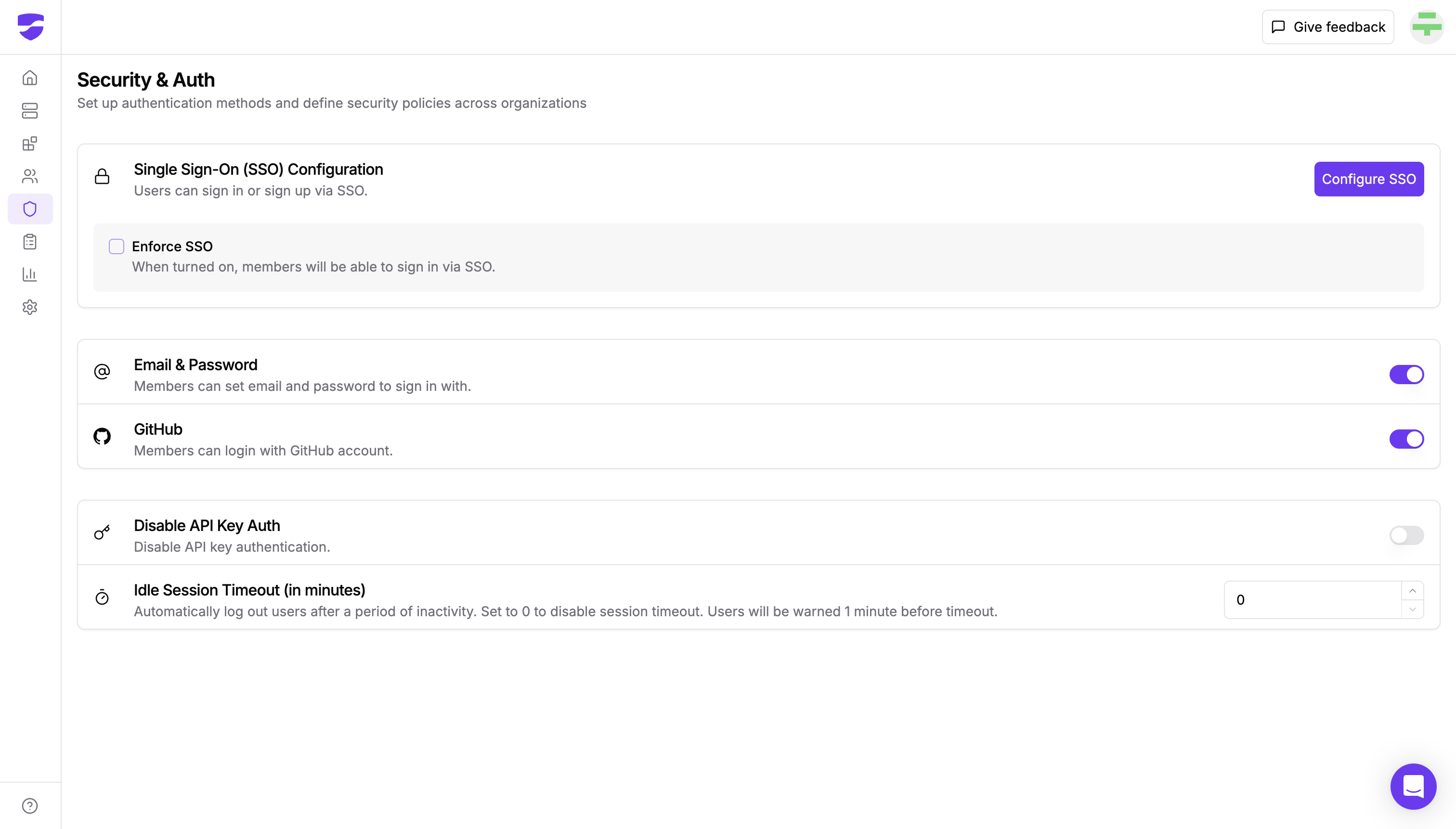 * Select allowed login methods — Choose which authentication options are available (SSO, GitHub, or email/password).