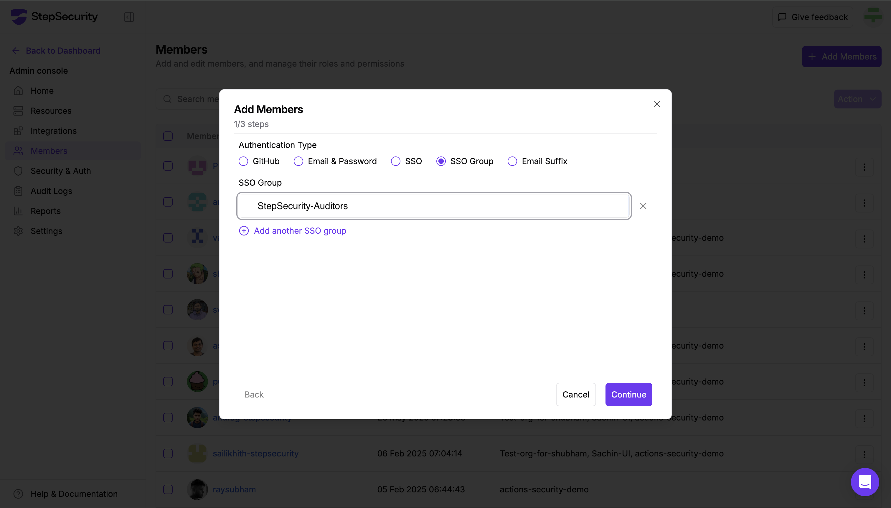 * Click "Add Members" on your StepSecurity dashboard and select the SSO Group option