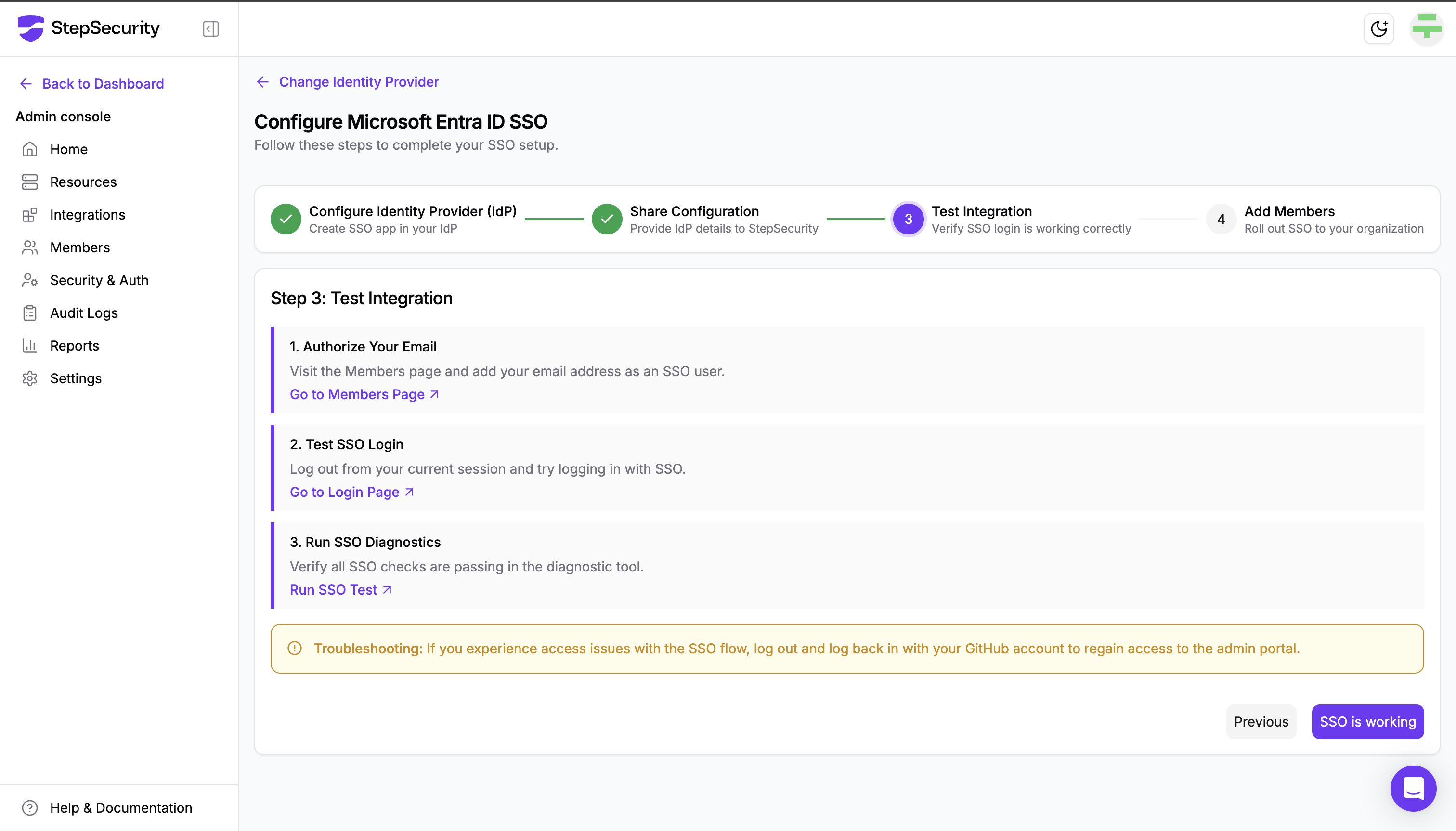 * On the StepSecurity → Security & Auth page, you can test your SSO integration.