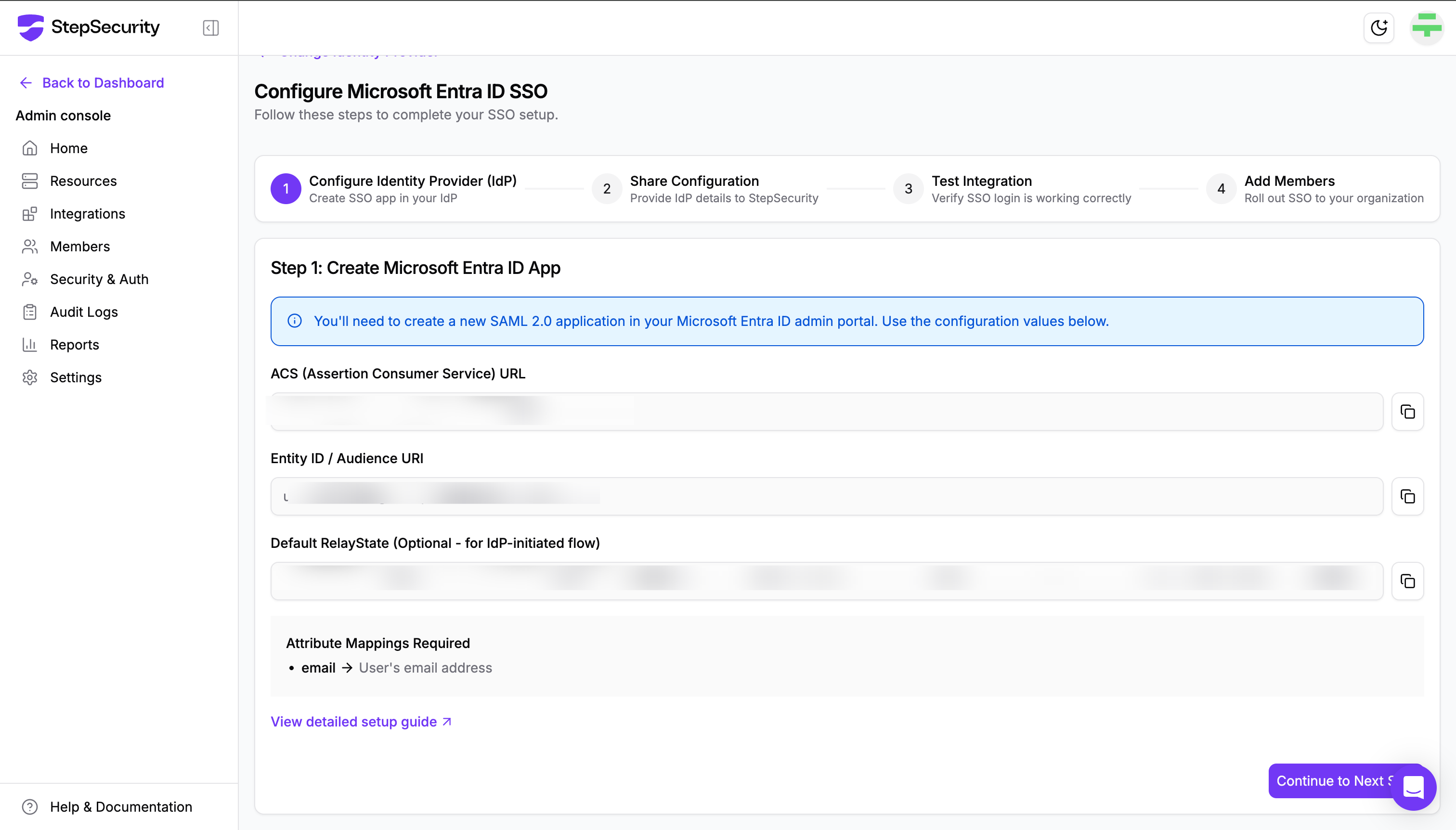 * On the StepSecurity App navigate to Admin Console → Security & Auth → Configure SSO → Microsoft Entra ID
