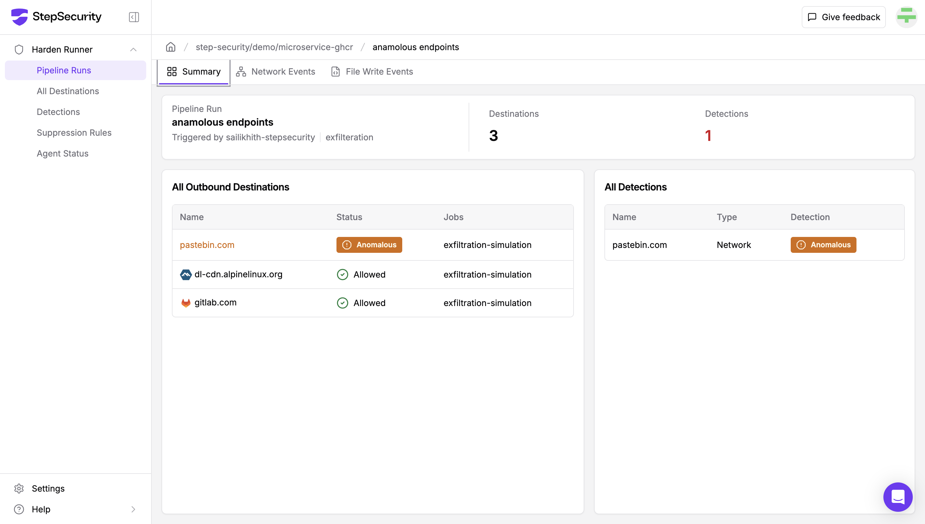 Get deeper visibility into your CI/CD workflows by viewing all executed process names, Process IDs (PIDs), and process arguments within your environment. This capability is especially useful for forensics and incident response, allowing you to understand what ran and why.