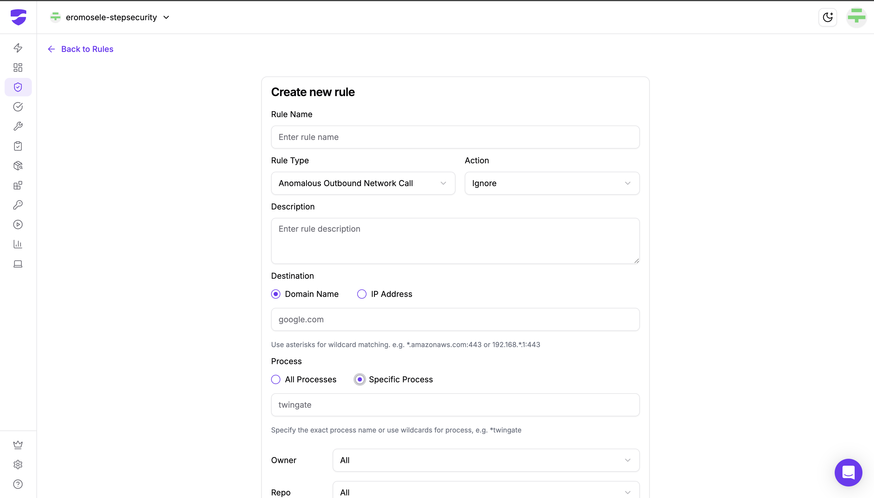 * Rule Type – Choose the appropriate rule type. The options shown will vary based on the [detection type](https://docs.stepsecurity.io/detections#types-of-detections).