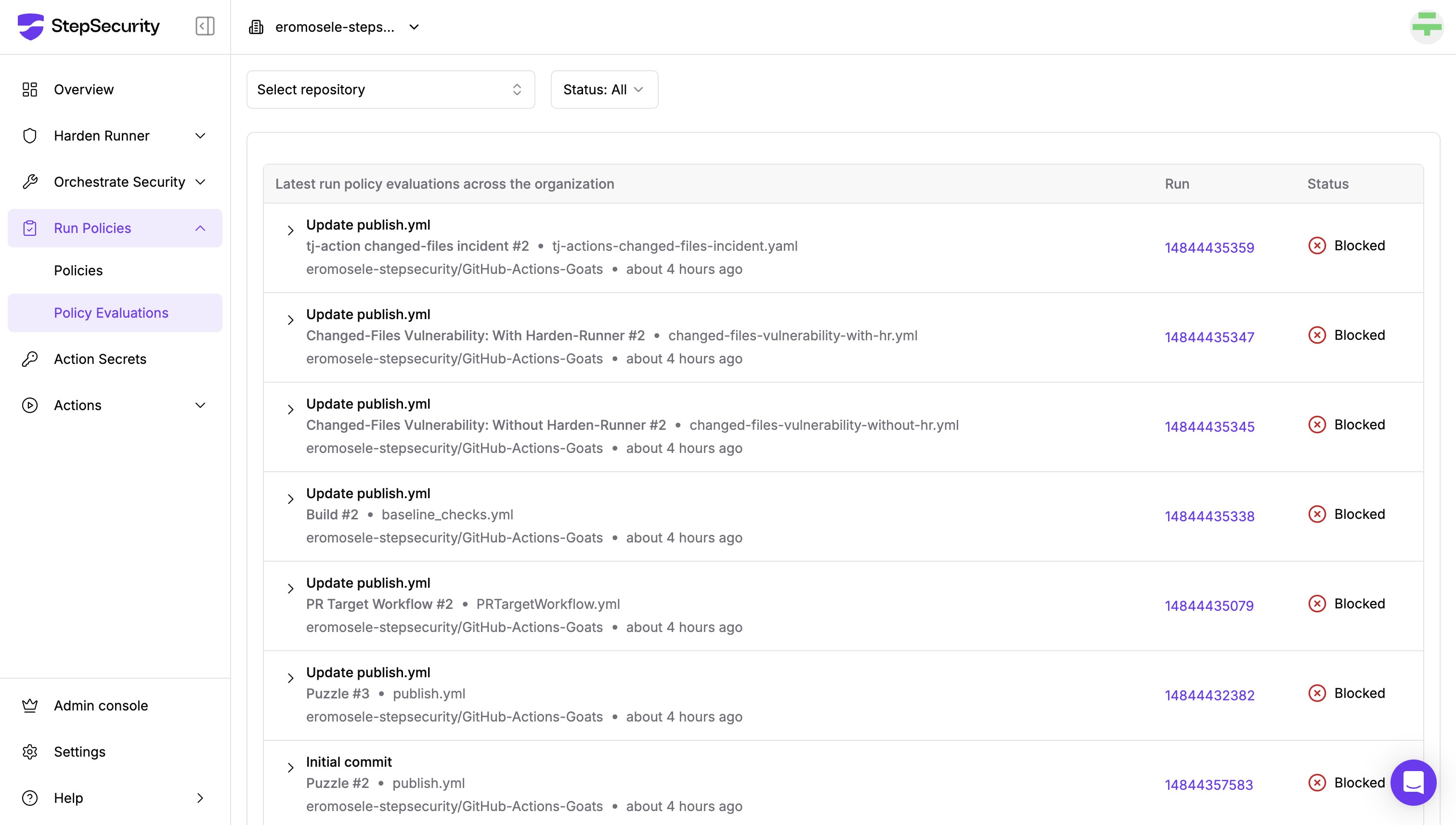To investigate blocked runs, go to the “Policy Evaluations” dashboard under Run Policies in the StepSecurity platform.